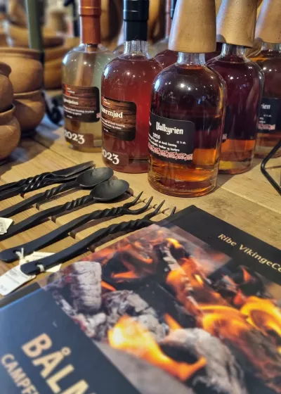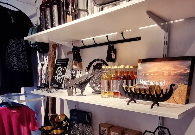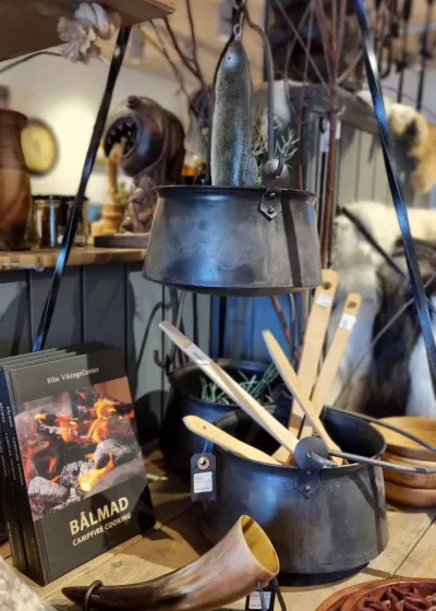 Im Laden bieten wir eine Vielfalt an Schmuck, Textilien, Keramik, Messer, Sachliteratur, Delikatessen, Met und natürlich Souvenirs. Für die Kinder haben wir Qualitätsspielwaren wie z.B. Schwerter, Schilde und Wikingerhelme. Eis und Quellwasser gibt es sogar auch.