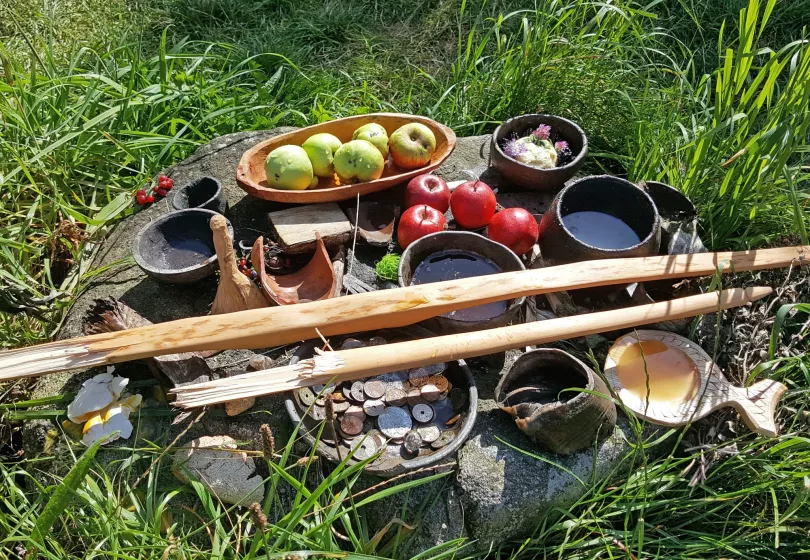 Das Moor ein heiliger Ort, aber es gab auch menschengeschaffene Kultstätten, genannt Hörgr und Hof. Hier opferte - blótete - man auch den Göttern. Diese Opfer konnten Nahrungsmitteln, Schmuck, Tiere, ja sogar Menschen sein.