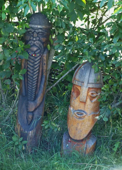Achtet auf die Götterstatuen und ratet, wen sie darstellen. Einige von ihnen sind leicht zu erraten, wenn man sich ein wenig in der nordische Mythologie auskennt. Vielleicht entsetzt euch das tote Pferd. Es ist ein Opfer für die Götter. Ein Pferd ist das zweitgrößte Opfer, das man bringen kann, und wenn das Pferd getötet wird, wird das Fleisch auf einer großen Party gegessen - ein Blót. Das Blut wird auf den Opferstein gegossen und die Haut wird aufgehängt, so dass jeder sehen kann, dass den Göttern ein großes Opfer gebracht wurde.