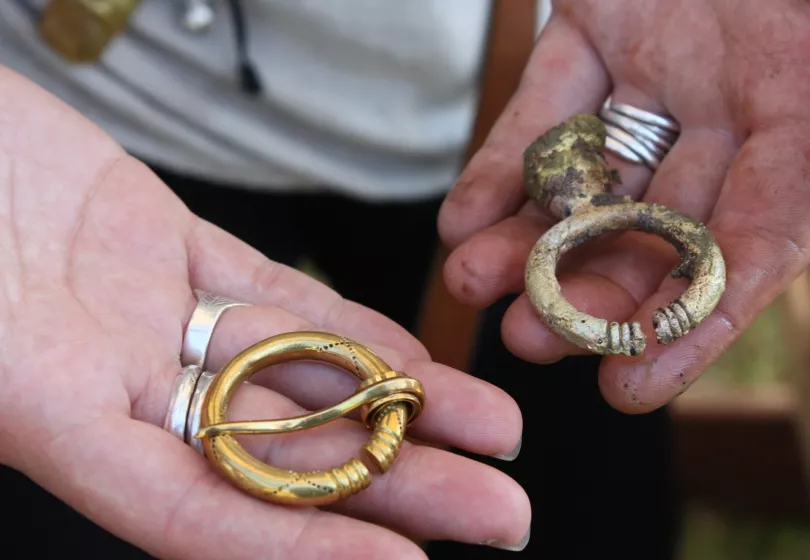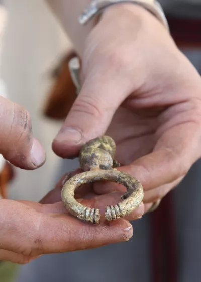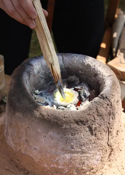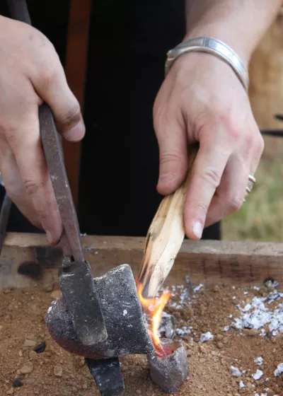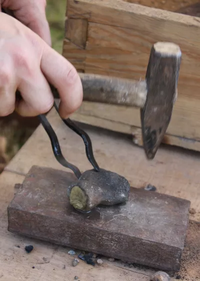 Während eines einzigen Tages baut er einen Schmelzofen, und schon ist er bereit, Gürtelschnallen, Zaumzeugbeschläge, Broschen, Fibeln usw. zu gießen. Vor allem werden viele der ovalen Schalenspangen gegossen, die die Frauen gerne benutzen, um ihre Trägerkleider zusammenzuhalten.