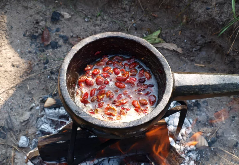 Melt the honey in a pot over low heat. When warm, add either dried or fresh hip berries:If you use dried hip berries: let the honey and hip berries simmer for 15–20 minutes.