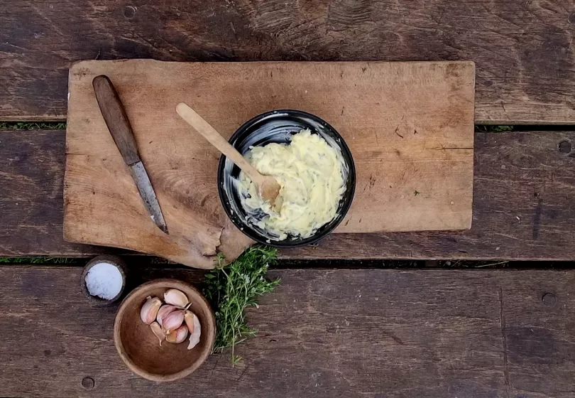 Chop the garlic and crush it with the salt, using a knife or a mortar. Mix the garlic, salt and finely chopped herbs into the butter. For instance, you could use thyme, ramsons or savory.Ingredients