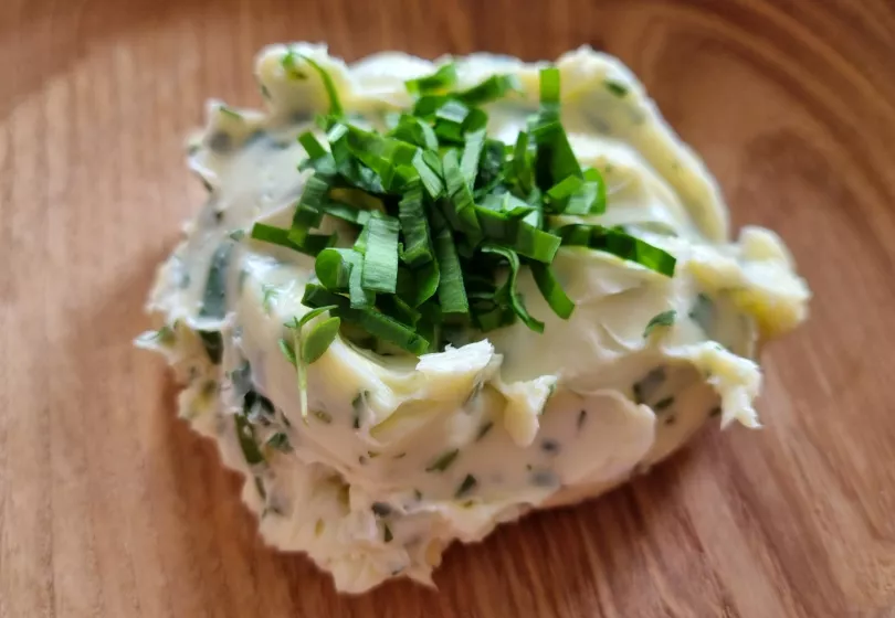 You can easily make a herb butter that is wonderful with chicken, steak, bread or root vegetables. Use herbs that are in season or those you like best. It could be garlic, ramsons, dill, savory, thyme, marjoram, spring onion tops or cress. In the modern kitchen you might also choose rosemary, parsley, oregano, basil, chives, tarragon, lemon zest, pepper, chilli and so on. Super easy, super quick.