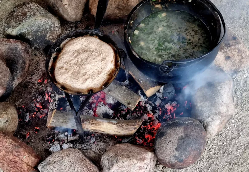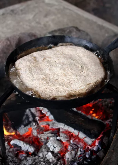 You do not necessarily need an oven to make delicious bread. Here's the recipe for a good bread baked in a frying pan over glowing embers. The taste and texture may remind you of a focaccia bread, and it is delightful both as a side dish or as warm bread for breakfast after a night sleeping under the stars.