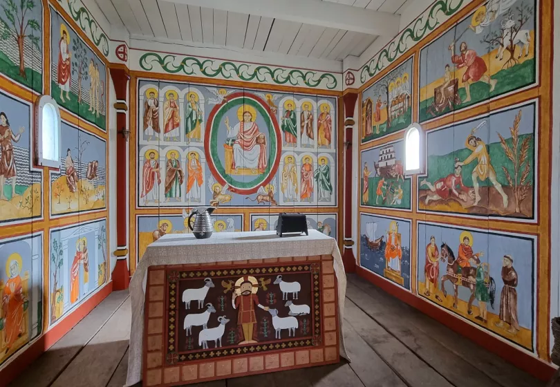 The size and construction of the church is based on a find in Tostedt near Hamburg where Ansgar was bishop. The decoration is done in typical styles of the time.