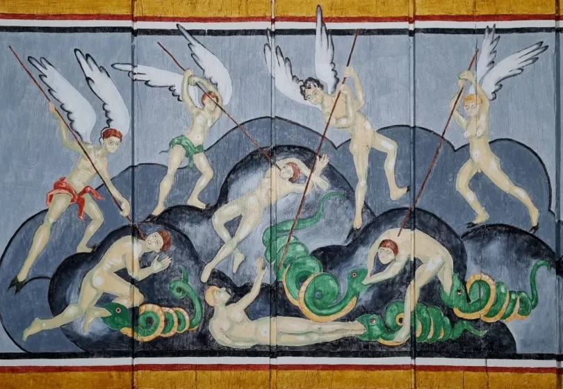 The paintings complete the atmosphere of the dimly lit Ansgar Church and they create a powerful setting for communicating the circumstances of the early Christian introduction. We hope the visitors to the church will get a sense of the ambience and impressions that embraced the first Danish churchgoers.
