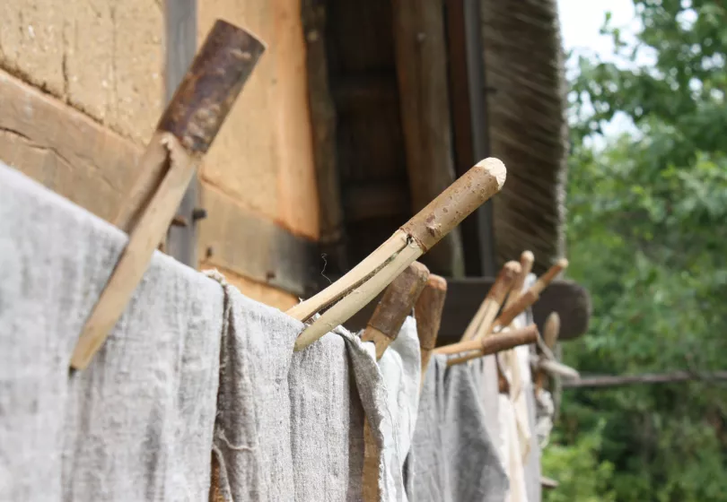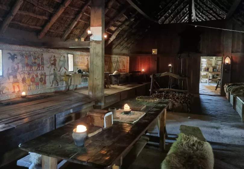 Ribe VikingeCenter has reconstructed seven town houses found in two different locations in Ribe. The three houses to the north are three different versions of the same house found i Tvedgade in Ribe. It is the same construction, but with different types of roofs. The four houses to the south were found east of the station. They stand here as a group exactly like they did in the Viking Age. The fact that they stand so close and none of them revealed traces of stables, is the indication of a town area. Compared to other Viking villages, the archaeologists found far more remnants of handicrafts and imported goods in and around the houses in Ribe. It suggests that a number of professional craftsmen, who for the most part depended on their trade alone to feed themselves, lived here.