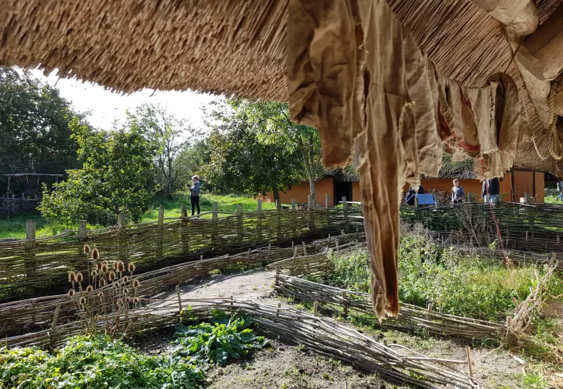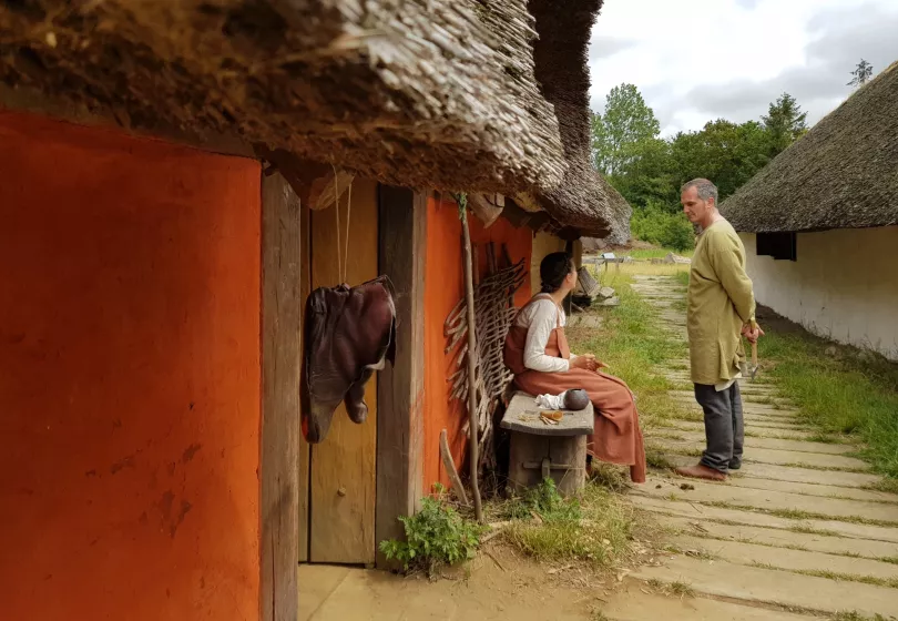 The Cobbler’s House has been reconstructed according to finds made east of the station in Ribe. The archaeologists found a group of houses standing very close together with traces of different crafts. Perhaps this house belonged to a cobbler who produced the different types of shoes that have been found during excavations in Ribe. Large quantities of leather pieces left over from shoemaking have been found, and from the cut-off scraps and the relatively poor use of materials, we can tell that skins were in good supply.