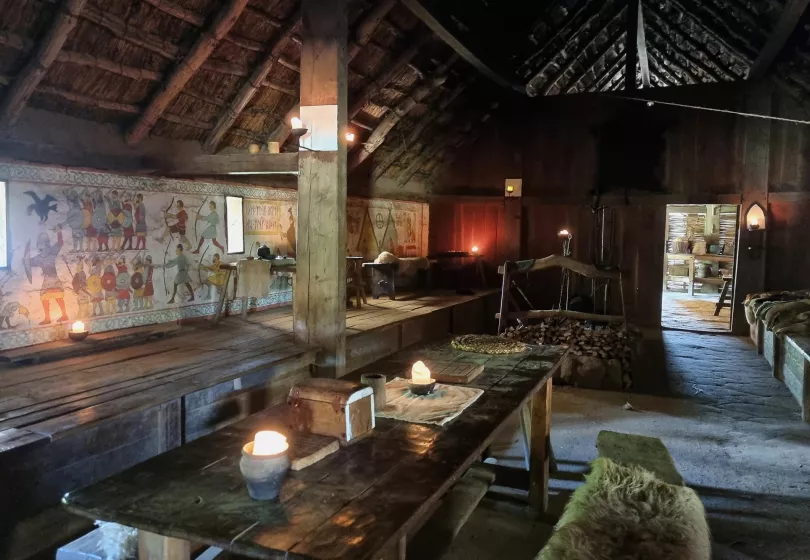 In the same area and from the same period of time another find was made. A 30 m long house with slightly curved wattle and daub walls and a thatched roof, It resembles the main buildings on the farms in the vicinity. The size of the house implies it must have belonged to an influential man. Perhaps it was the residence of the person in charge of the nearby marketplace. The house has a sleeping area, en entrance hall, a main hall as well as a kitchen area consisting of two rooms. This may indicate a rather large household. In Ribe VikingeCenter we have named the building the Thing-hall even if we know of no sources of Viking Age thing-halls as it is the case with thingsteads.