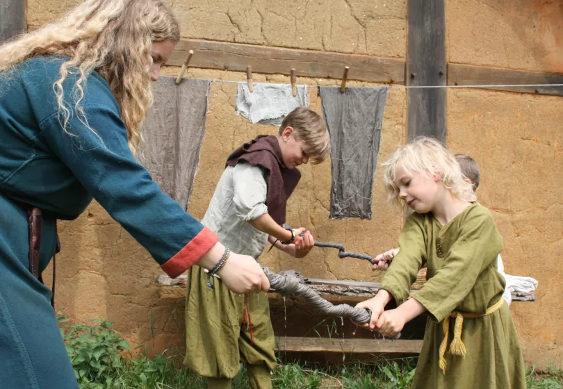 Only a narrow alley separates this house and the neighbouring Cobbler's House. The excavation revealed traces of craft activities, and apart from a door at the gable end, this house also had a double door on the side. In Ribe VikingeCenter the house is the Carpenter's Workshop where also our visitors can try their hand at whittling using the carpenter's shaving horse and drawing knife.