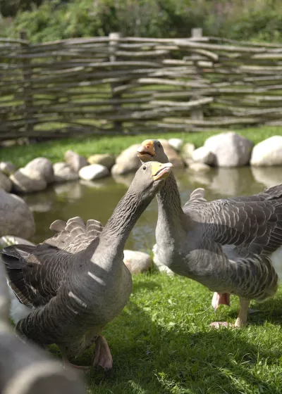Geese have also been kept as useful animals in Denmark since antiquity. The eggs may have been collected from wild birds and then hatched in the hen house. This was standard practice right through to the middle of the 20th century, when it was banned. Archaeological finds show that geese were popular in the Viking Age, both because of the meat and because the flight feathers would be used for arrows. The Danish goose, which was bred from the wild goose, is usually grey or mottled grey-and-white.