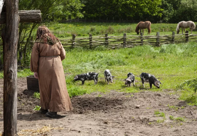 The Vikings really valued the pig. The adaptable, omnivorous animal was easy to keep, and the fat meat was an important part of the diet. The Danish piebald landrace stems from the old Danish land pig. It is very hardy and can be kept outdoors throughout the year. The sows show excellent maternal qualities and have large litters of viable piglets.