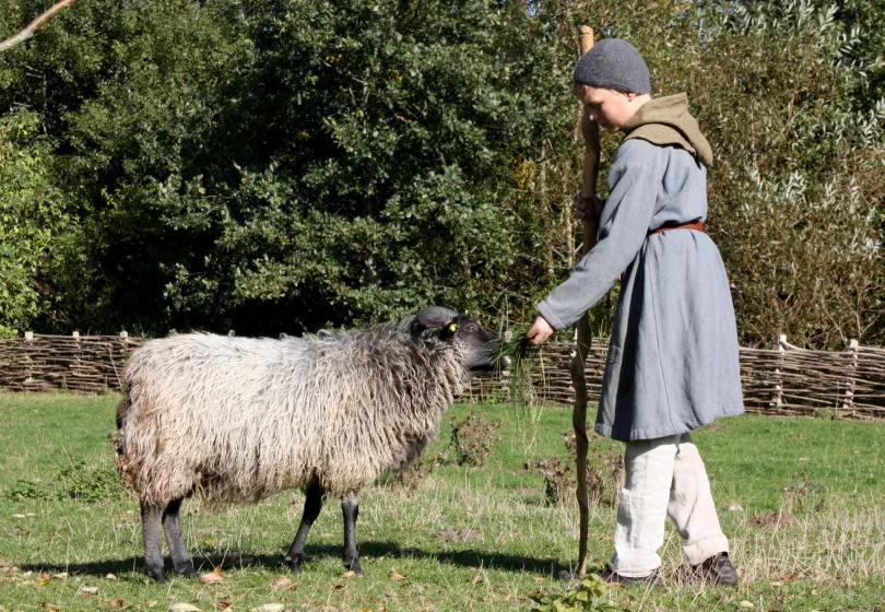 Ribe Viking Centre has heath sheep, because this breed is fairly pure, and very similar to the Viking breeds of sheep. It is small, weighing 12-18 kilos, and has a naturally short tail. Both sexes have spiral horns, but the rams' are larger. Their fleece comes in various shades of grey. There are two sorts of wool: a soft, short and isolating inner wool close to their bodies, and the outer wool which is long, thick and smooth, and can make water glance off the fleece. In late spring, when the frosts are over and the grass has begun to grow, the lambs are born. The heath sheep usually bears only one lamb, which will be completely coal black for the first month.