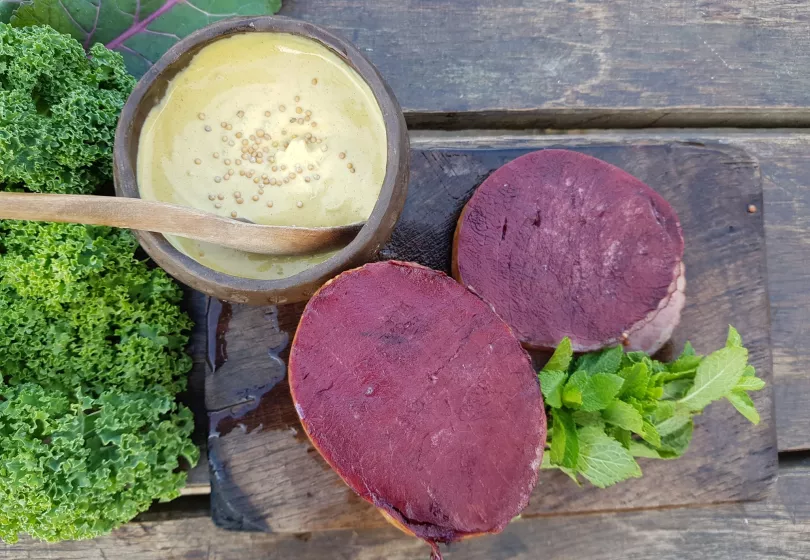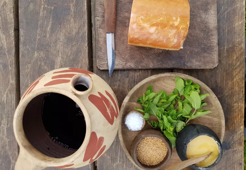 Pour the wine, water, mint, mustard seeds, salt and honey into a pot and bring to the boil.Add the meat and let it simmer for about 45 minutes (core temperature 75°C). Then leave the ham to rest in the liquid for 20 minutes.