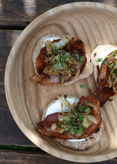 Serving: Start with a warm flatbread and spread fresh cheese on it. Add a slice of bacon, then soft onions and a sprinkle of thyme.