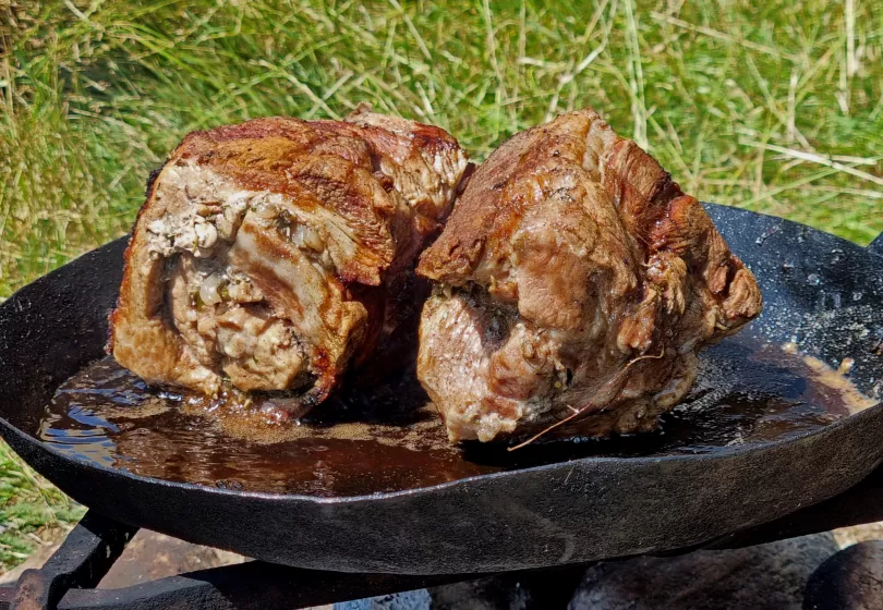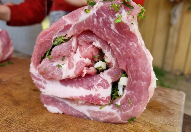 After rolling the pork neck with herbs, the joint is simmered gently in water before being left to rest. It is then browned in a pan or grilled and rested again. The result is a tender, juicy roast that serves many.