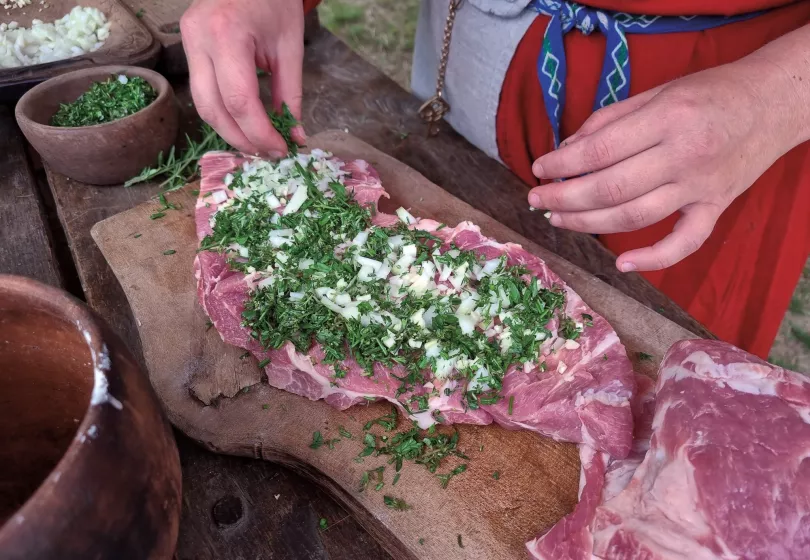 The pork neck fillet should be butterflied and about 1.5 cm thick. Mix onions, garlic, herbs and mustard seeds and distribute on the meat. Sprinkle with 1 tbsp salt and firmly roll up the meat. Tie with string.Bring a large pot of water with 1 tbsp salt to the boil. You can add an onion, some garlic and thyme to the water for extra flavour. Let the meat simmer for about 1.5 hours, then lift it onto a board and leave to rest for about 15 min.