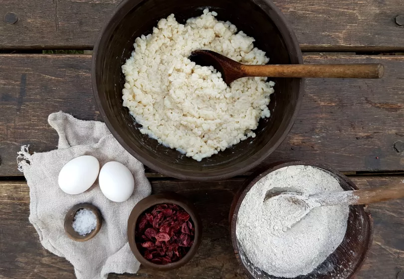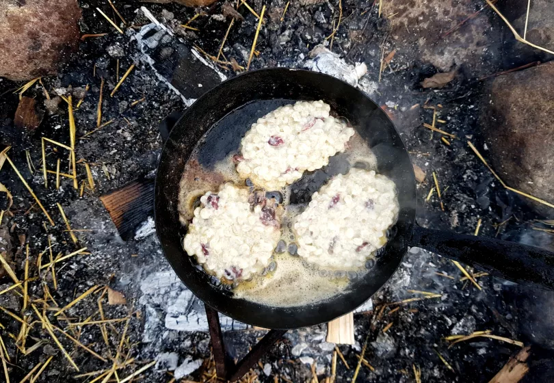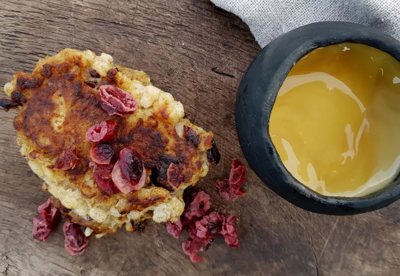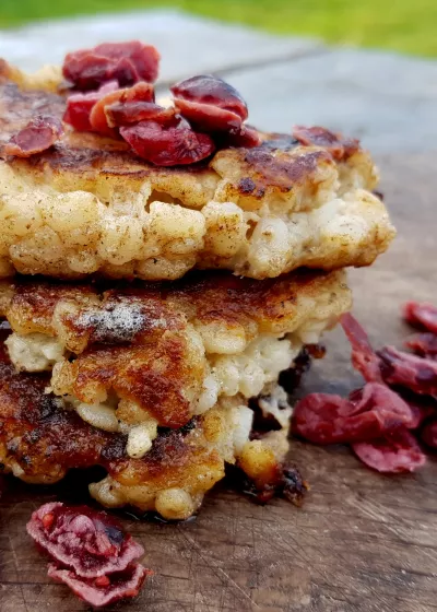 Mix the cold porridge with the eggs. Then stir in salt, dried berries and flour. The mixture should have the consistency of a thick porridge.Melt a good knob of butter in a frying pan. Cook spoonfuls of the mixture in the pan until both sides are golden brown.