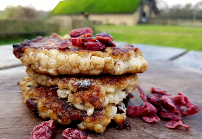 You can use leftover porridge made from barley, oat, rice etc. Add berries and spices like e.g. modern day cinnamon, raisins or orange. Porridge pancakes are great for brunch or dessert.