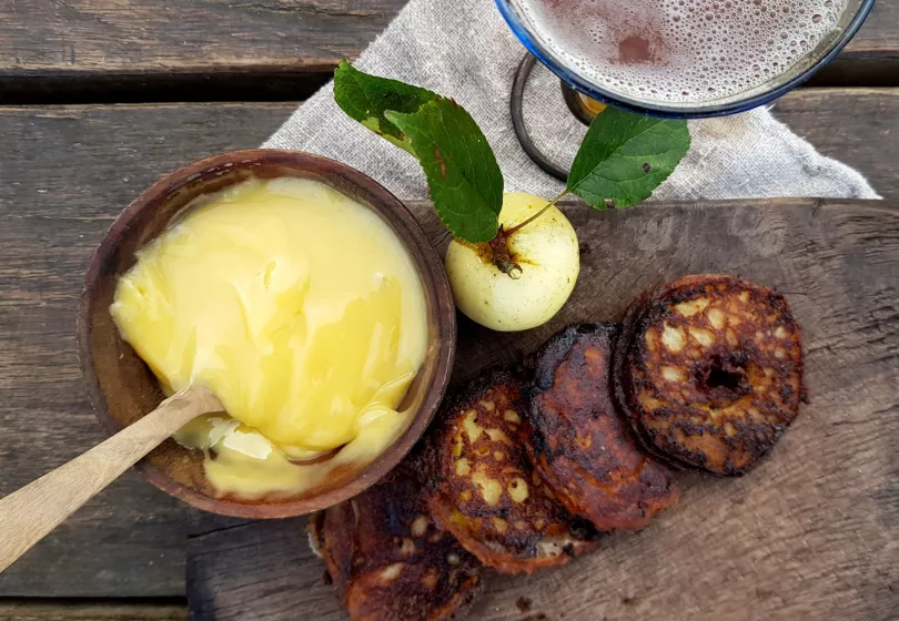 Mix the rye flour, wheat flour and salt. Add most of the buttermilk and the beer and whisk well. Beat the honey into the batter, then add the eggs. The batter should have the consistency of a slightly thick pancake mixture. Adjust if necessary with the remaining buttermilk. Leave the batter to rest while you prepare the apples.Cut the apples into 0.5 cm thick slices and remove the cores. Pat the apple slices dry.