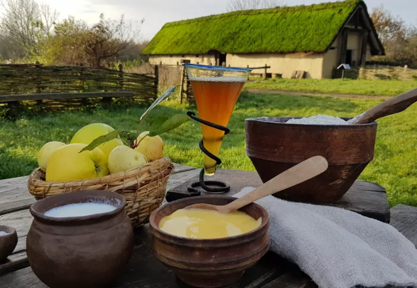 In Danish 'Aebleskiver' (apple fritters). 'Aebleskiver' have been part of Danish cooking for many hundred years. Today, we know them as pan baked spherical puffy cakes that the Danes eat great many of at Yule time. It was not until the 19th century, however, that the round delicacies became linked with Christmas. It was not unusual for farm servants to receive their Christmas present in the form of apple fritters and spiced biscuits. Earlier, in the Middle Ages, 'Aebleskiver' were slices of apple dipped in batter and pan fried in butter.