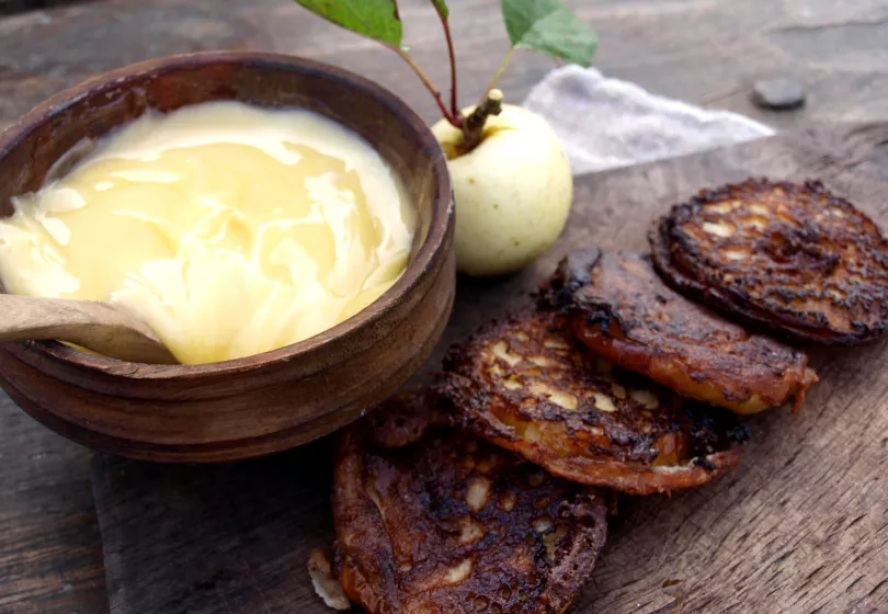 Heat the fat in a pan. Dip the apple slices in the batter and fry them for about 3–4 minutes on each side until golden and crisp.