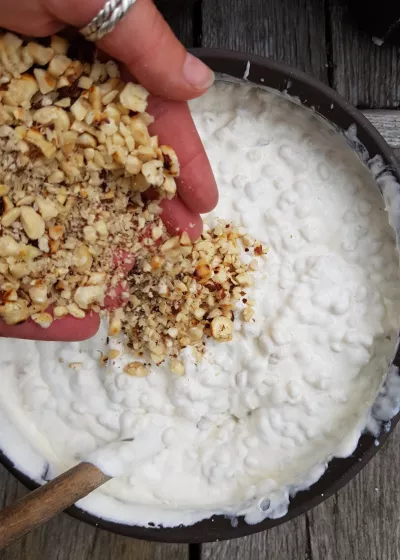Whip the cream until thick. Stir the cold barley porridge to loosen it a little. Fold in the whipped cream with care. Add the chopped nuts.