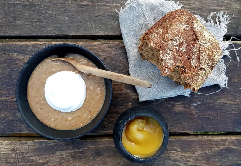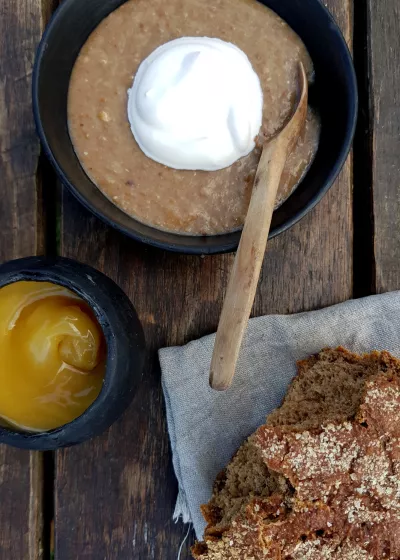 In Danish 'Øllebrød'. Beer 'n bread. A traditional Danish porridge made from stale rye bread. Because in DK we do love our rye bread and back in the days you would make use of every last crumb. There is room for experimenting, too, so get on with it and invent your own favourite. You can use ale, malt beer or simply just water. For sweetness use honey, white sugar or brown sugar. Finally, give your Beer 'n bread porridge a twist with for instance a little orange, lemon, cinnamon, vanilla or raisins.