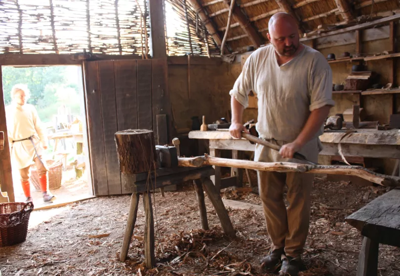 The carpenters are constantly building new houses, making furniture and repairing old things. They have their workshop in Ribe Town, 825 AD, but you can meet them anywhere on the grounds of Ribe VikingeCenter. Notice their skill in handling their tools - and then note the impressive quality of the hand forged tools themselves!