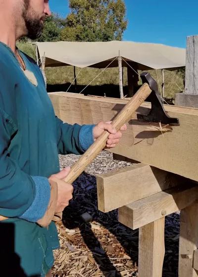 Fra maj, når Ribe VikingeCenters åbningssæson starter, vil en del af byggeriet også ske i Ribe VikingeCenters åbningstid som en del af formidlingen. Vores gæster er meget interesseret i at følge arbejdsprocesserne, når vi bygger stort. De frivillige medbyggere, der har tid og lyst til også at hjælpe på byggeriet i åbningstiden, er meget velkomne til det. I åbningstiden bærer håndværkerne vikingedragt og skal være ekstra opmærksomme på at være autentiske.