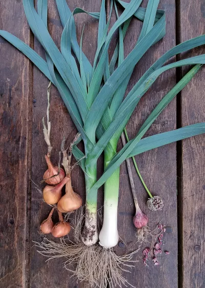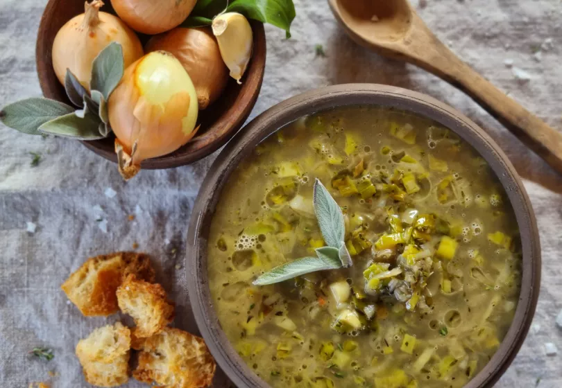 Smelt en god klat smør i en tykbundet gryde og tilsæt salvie og timian. Lad det syde lidt, så smørret får smag af urterne.Tilsæt alle løgtyperne og steg ved lav til middel varme i ca. 30 min. indtil løgene er helt bløde og gyldne. Rør jævnligt i gryden. Tilsæt evt. lidt mere smør, hvis løgene vil sidde fast på grydens bund. Når løgene er gyldne, tilsættes fond/bouillon (okse-, hønse- eller grøntsags-). Lad suppen simre ca. 15-20 min.