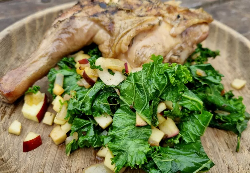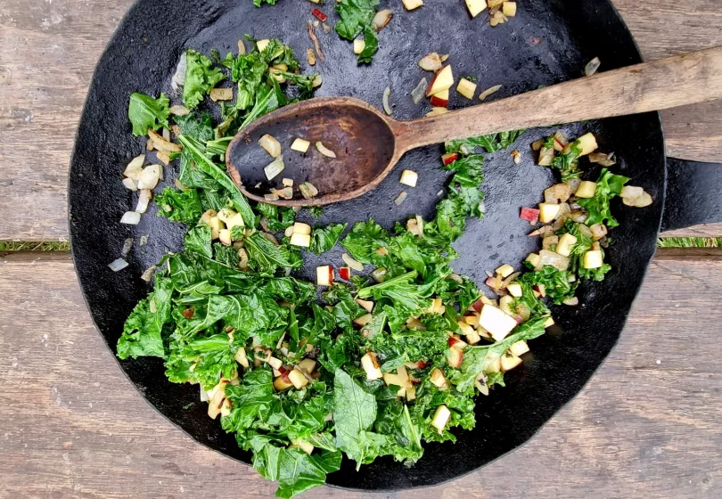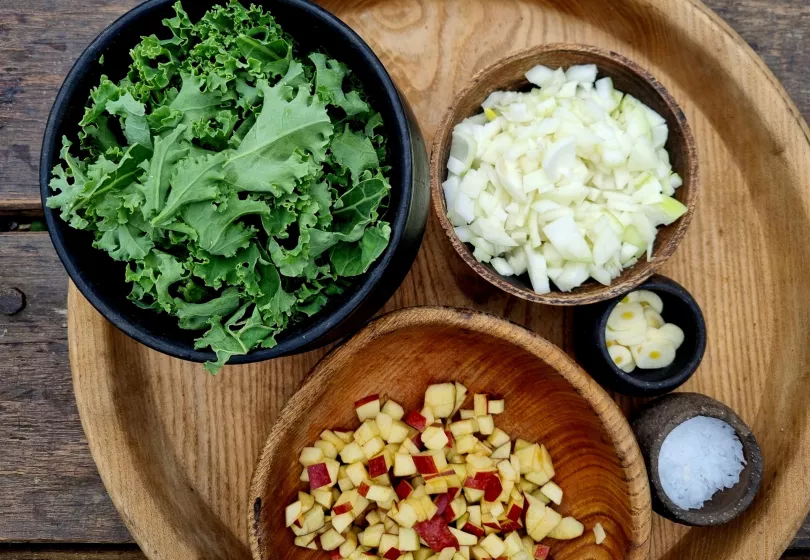 Smelt smør på en varm pande og svits løg og hvidløg. Riv grønkålen i mindre stykker og kom det på panden. Lad det stege 5 min. under omrøring.Drys med salt og tilsæt æbletern, før der røres en sidste gang.