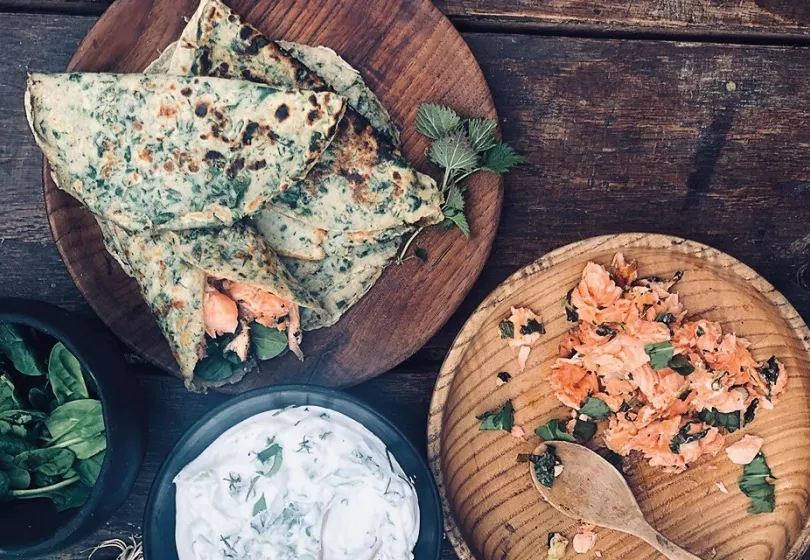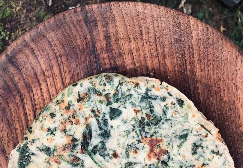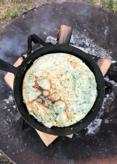 Spinat- og brændenældeblade vaskes og blancheres i kogende vand ca. 1 min. Bladene drænes og snittes.I en skål blandes mel og salt. Tilsæt mælken lidt efter lidt under omrøring. Kom derefter æggene i og pisk til dejen er jævn. Lad dejen hvile ca. 15 min.