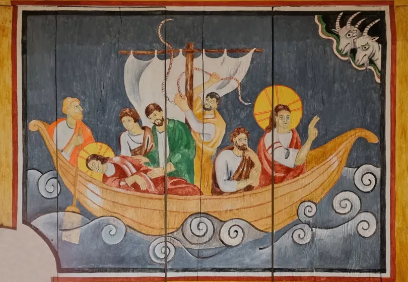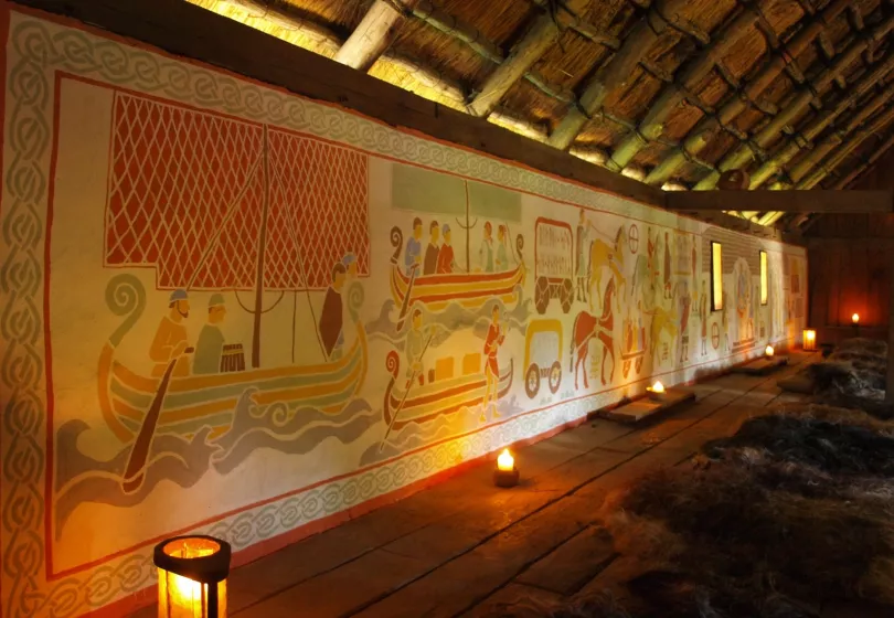 Vikingernes billedverden var rig, spændende og ofte også farvestrålende. Den bestod af fortællende billeder og symboler på vægge, i udskæringer, på billedtæpper, hugget i sten m.m., og det kan også opleves på Ribe VikingeCenter.
