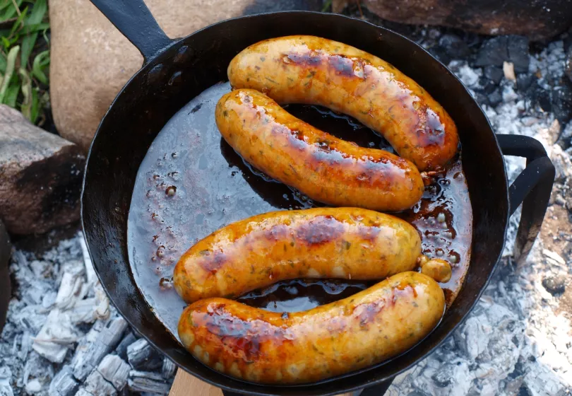 I stedet for at glasere pølserne på en pande, kan de steges på havegrillen.