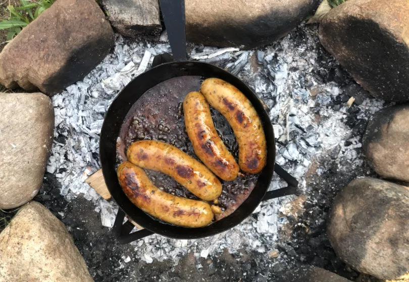 Sæt en gryde med vand over bålet. Når vandet er lunt, lægges pølserne i. Lad vandet langsomt nå kogepunktet. Pølserne skal simre i ca. 15 min.