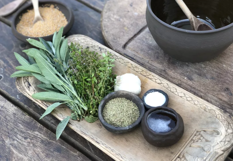 - 1-2 håndfulde friske krydderurter, f.eks. timian, salvie og merian, finthakket