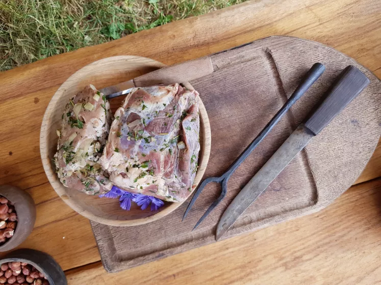 Bland løg, urter og øl i en skål eller gryde.Lad kødet marinere i lagen i 12-24 timer.