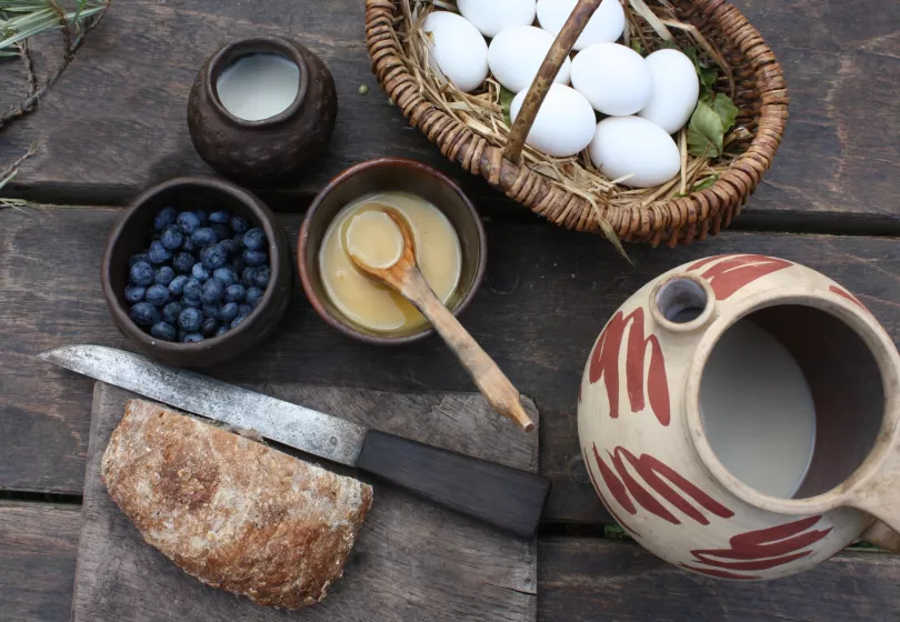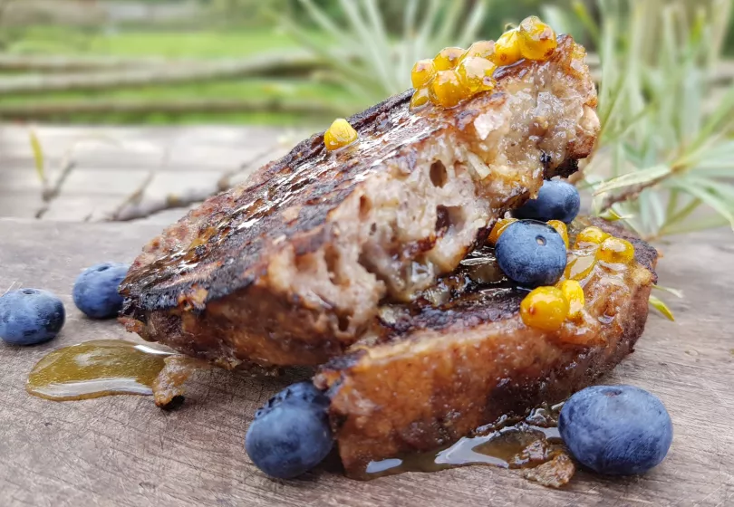 Smørsteg brødskiverne på en pande til de er gyldne på begge sider. Servér straks med friske bær og honning.