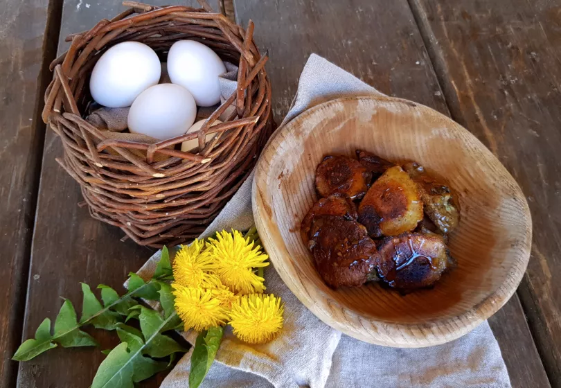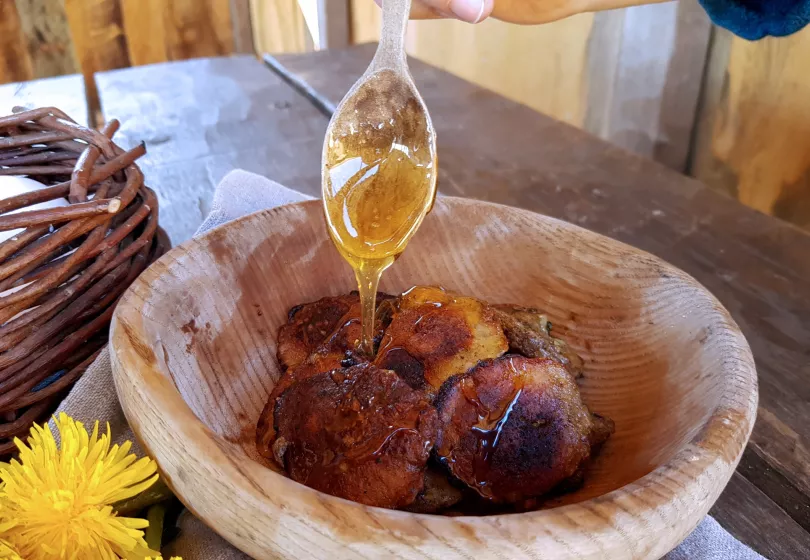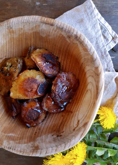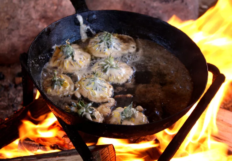 Mælkebøtten finder man næsten alle steder, og man lægger især mærke til dem, når de gule blomster lyser op. Mælkebøtteblade, -knopper og -blomster kan faktisk spises, men pluk af de planter, der står i skyggeområder. De er ikke så bitre. Gå efter friske, lysegrønne blade, og til disse nemme mælkebøttefritter skal I bruge friske blomster. Skyl dem rigtig godt, ryst vandet af og tør forsigtigt blomsterne i et viskestykke. Så er I klar til at lave fritter over bål!